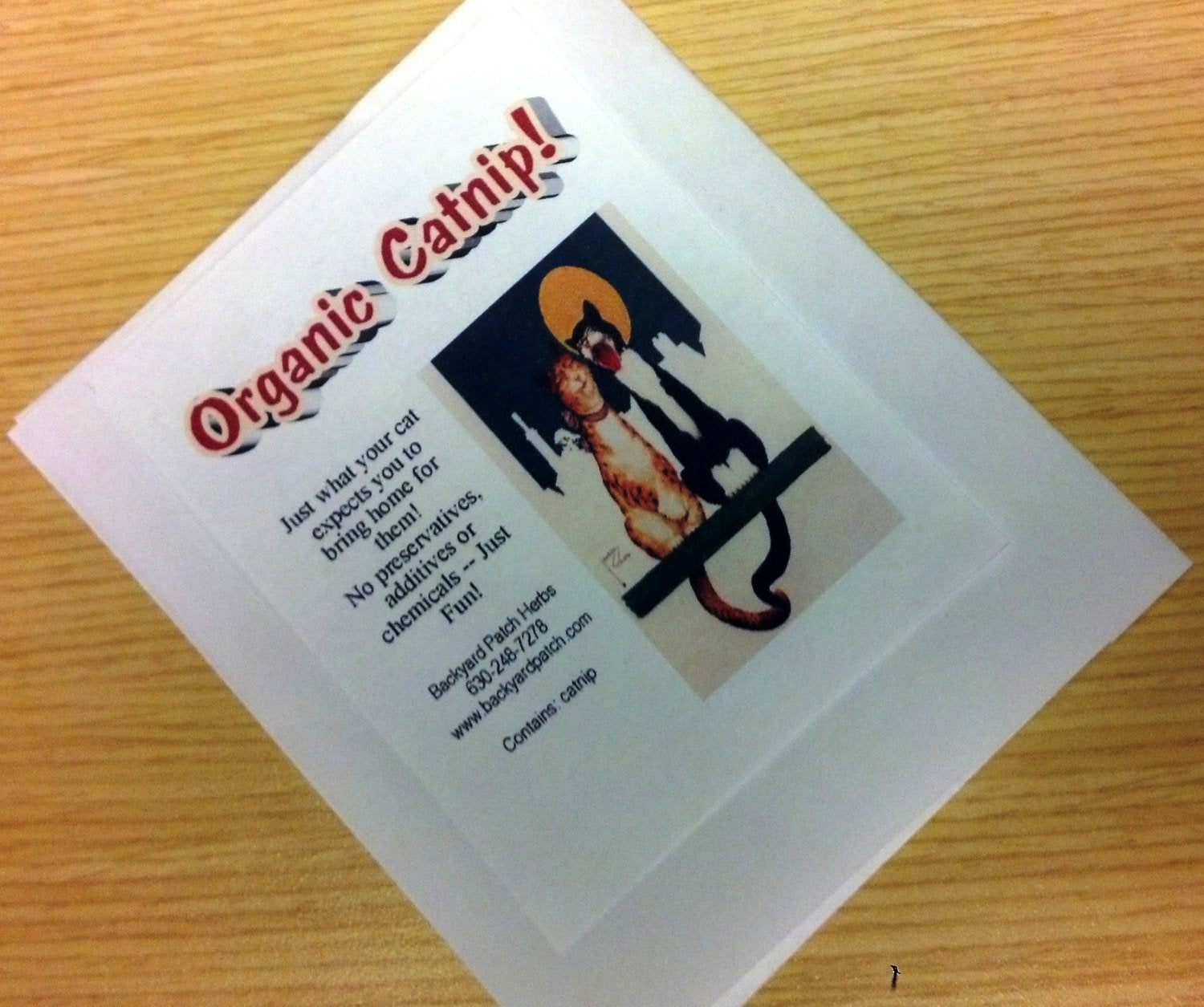 The Backyard Patch sells Catnip as a single herb packaged for cats, but it is the same organic/chemical-free herb we use in our herbal teas and bath items. It can be purchased for your cat or you can make them share with you. For the cat we recommend sprinkling it on the floor or tying it in the toe of a sock or nylon.