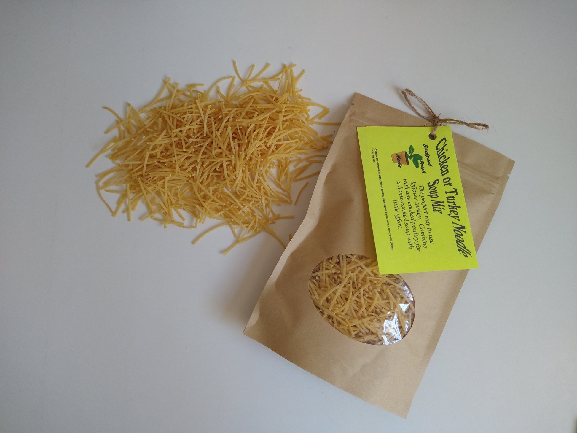 Chicken Noodle Soup Mix - Add any left over poultry, chicken or turkey, to this tasty broth based noodles soup for a quick and tasty meal. Full instructions are included. Contains thin egg noodles, chicken bouillon, parsley, thyme, pepper, bay leaf.