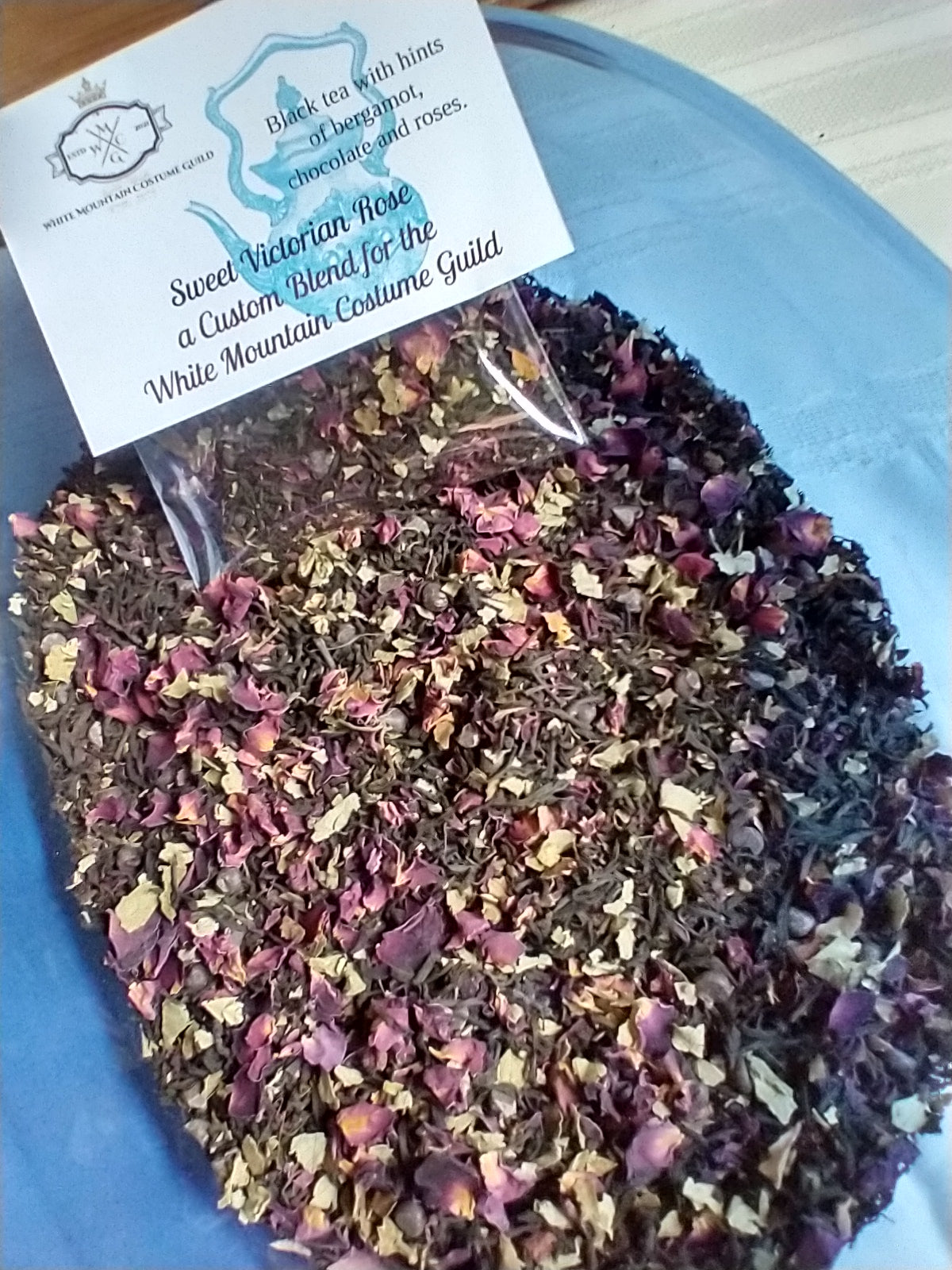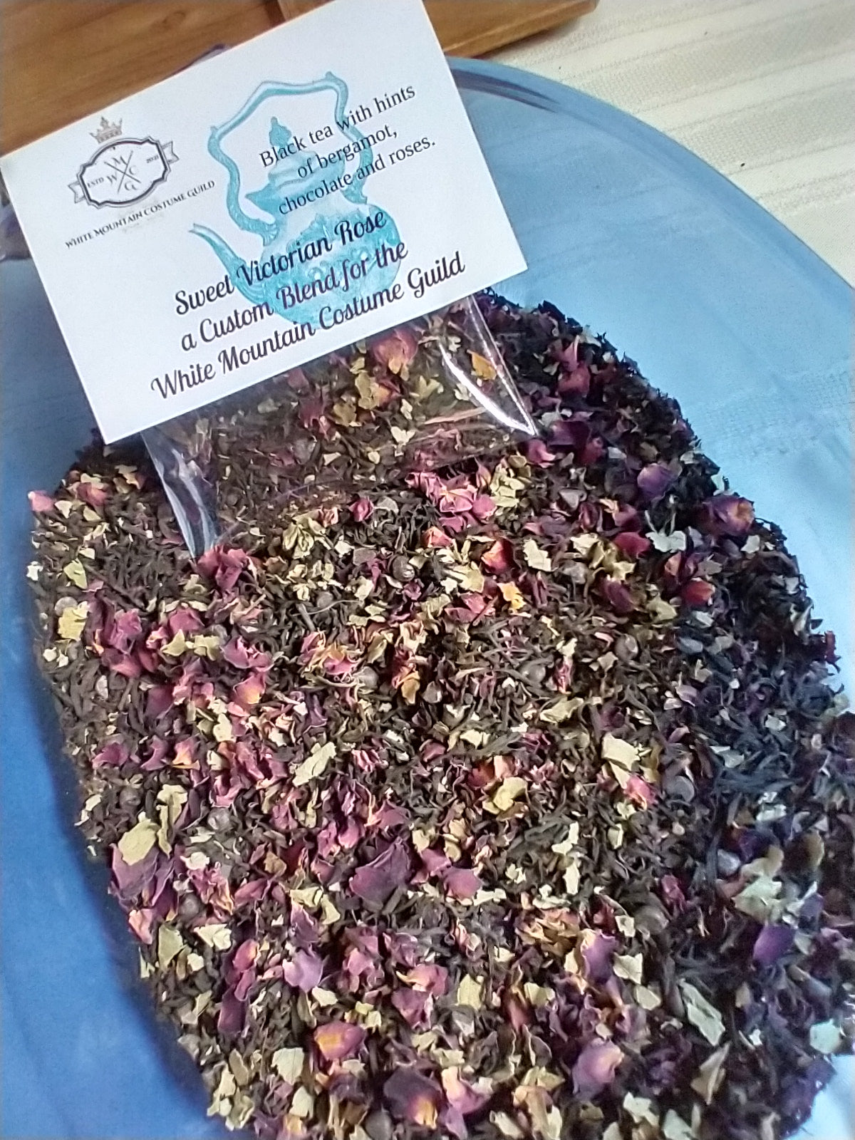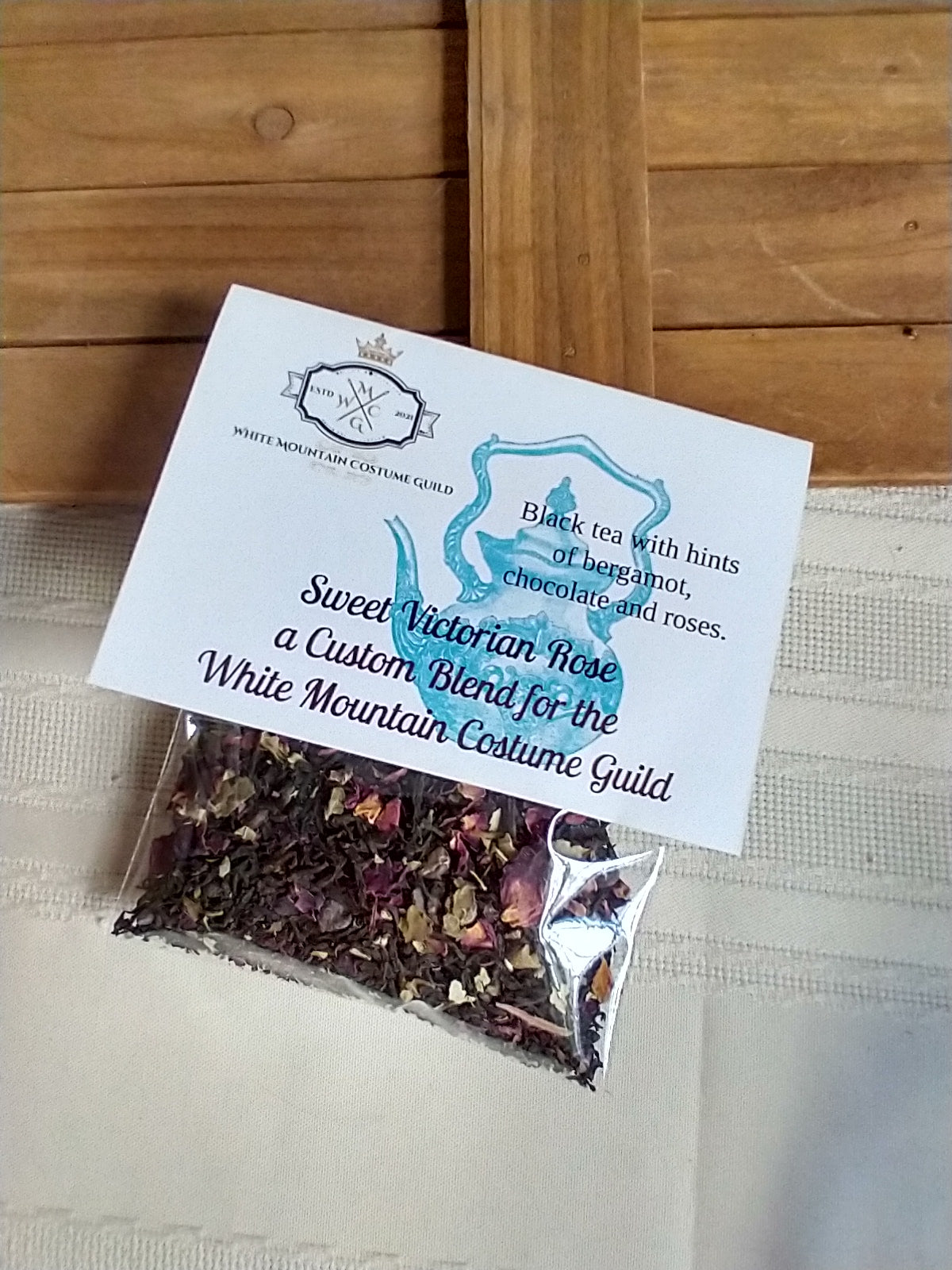 This wonderful special blend created for tea with the White Mountain Costume Guild uses Black tea infused with bergamot oil paired with rose petals, blackberry leaf and chocolate to give your a sweet yet earthy combination that is enhanced by a bit of sweetener.