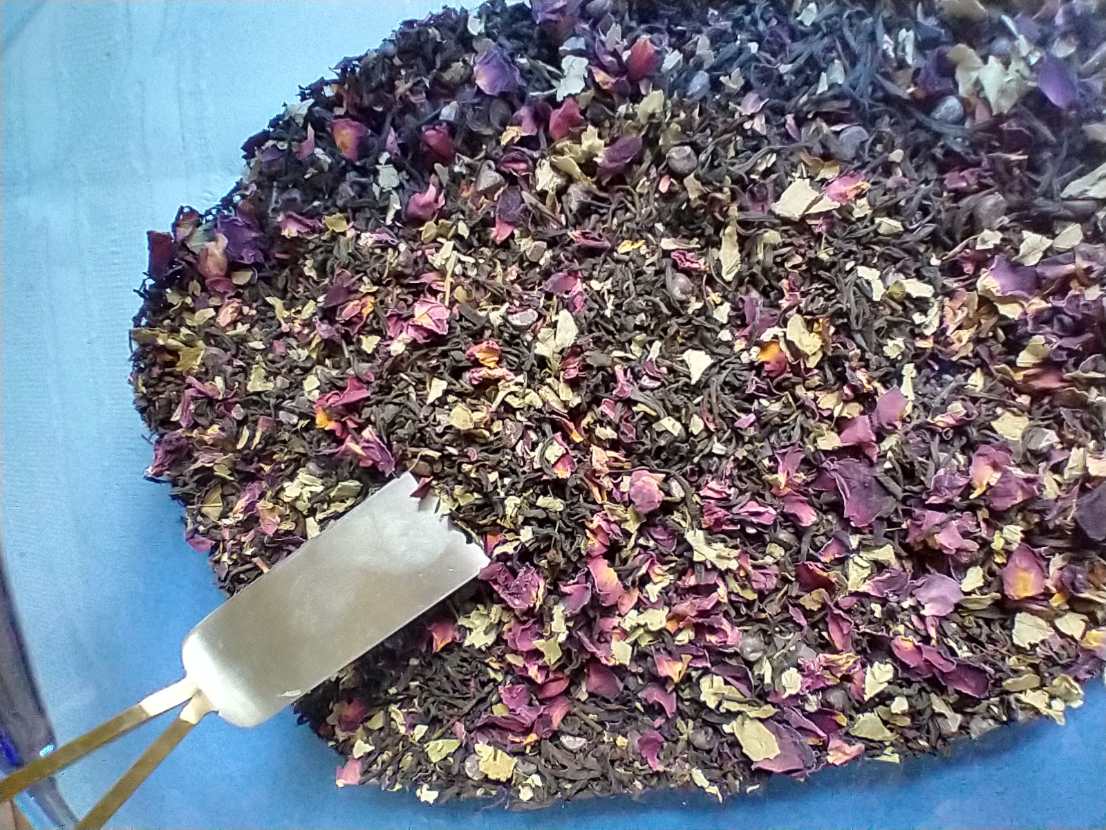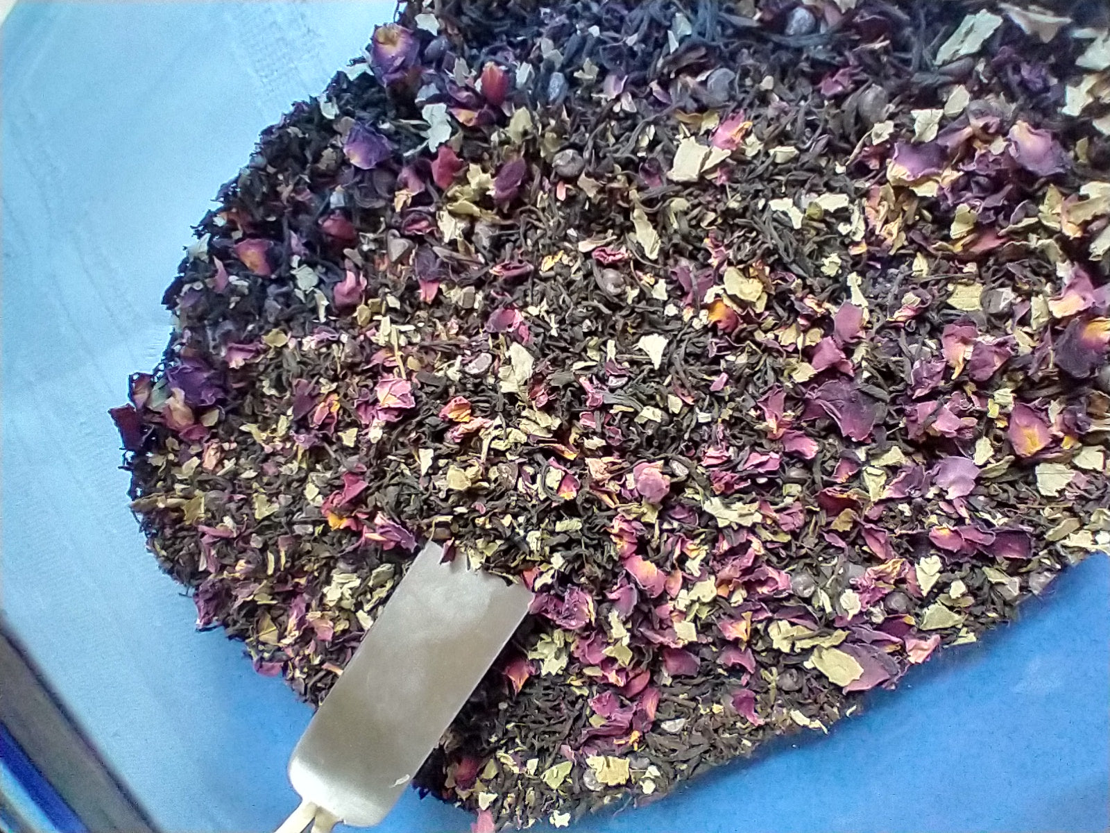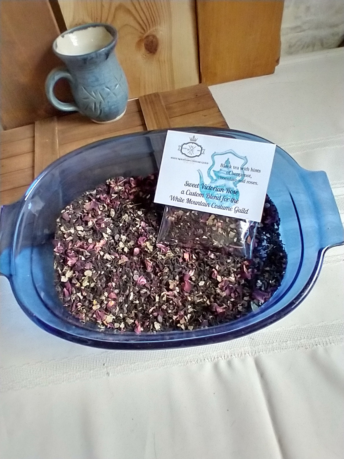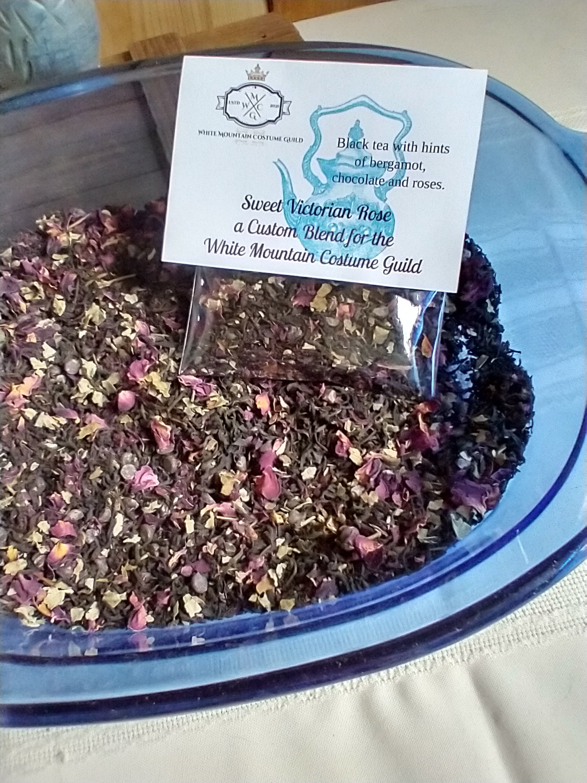 This wonderful special blend created for tea with the White Mountain Costume Guild uses Black tea infused with bergamot oil paired with rose petals, blackberry leaf and chocolate to give your a sweet yet earthy combination that is enhanced by a bit of sweetener.