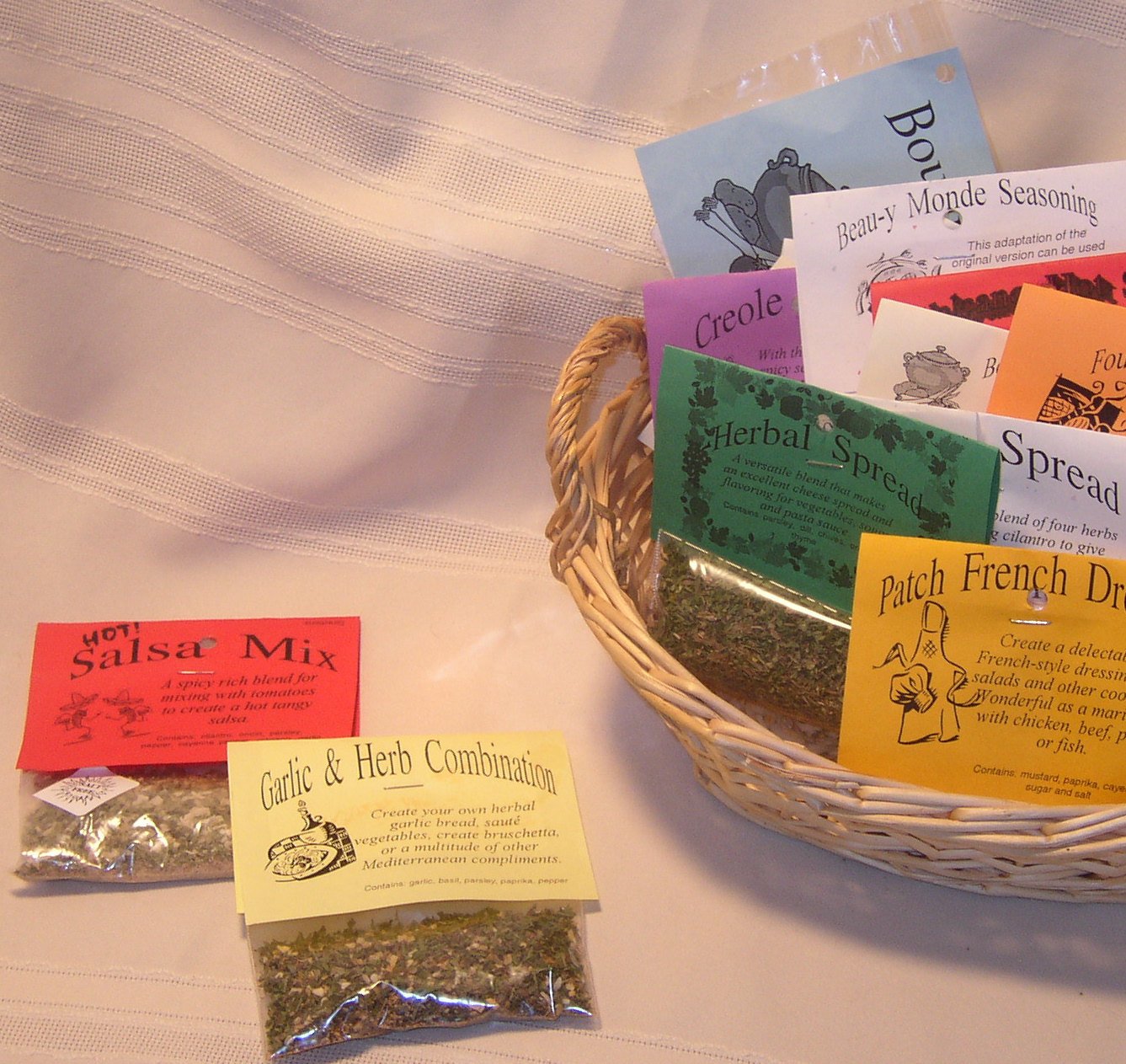 I make 39 different "Herb Mixes." Each is blended to make a specific food item, like a dressing, rub, dip or spread. Recipes and tips for using the blend are included. These are packaged in a zip seal pouch with decorative labeling.
