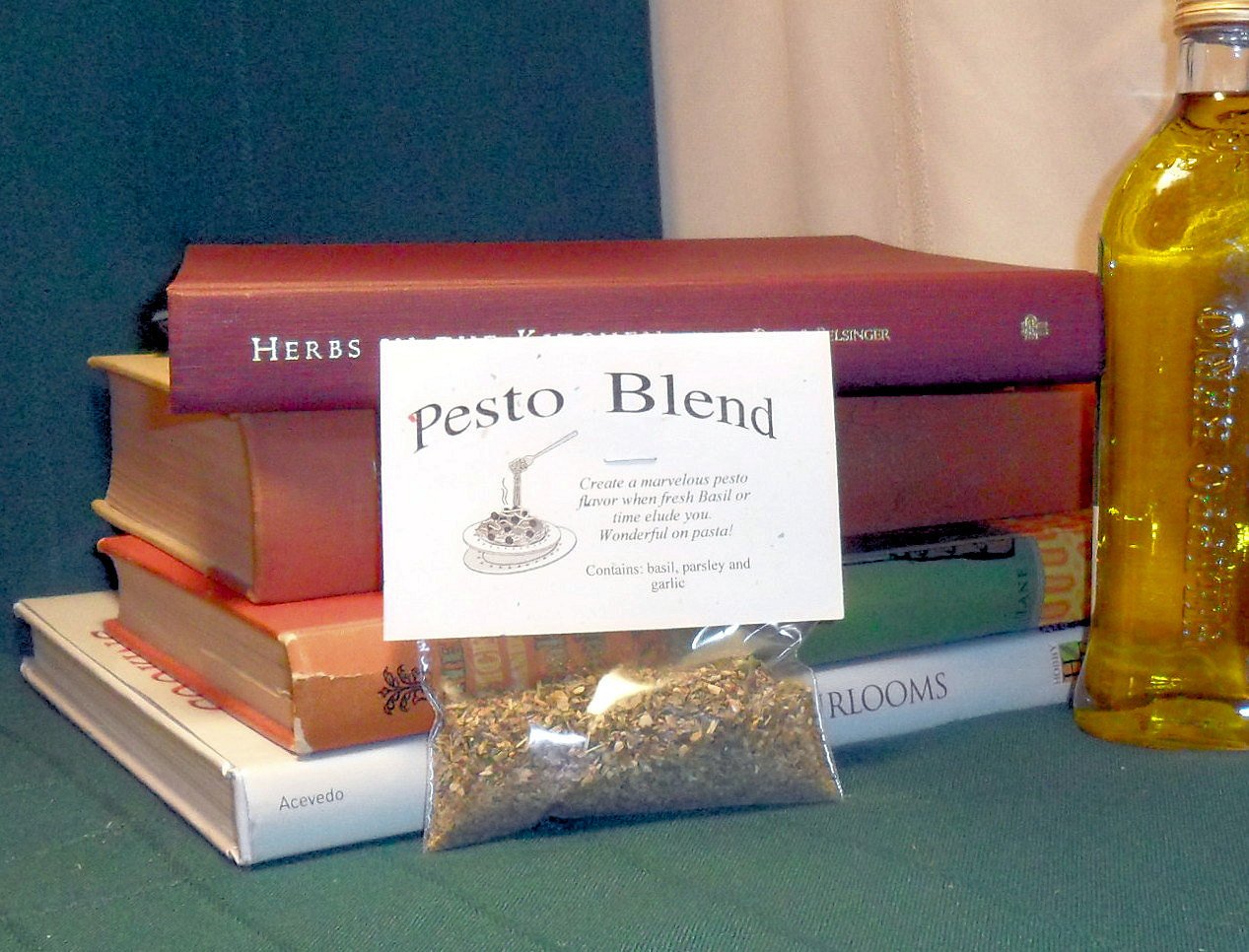 Pesto Herb Blend with Sun-Dried Tomatoes - A great basil-rich mixture for olive oil that can be tossed with pasta or used on bread. Perfect in winter when fresh basil is scarce! Contains basil, garlic, parsley and real sun-dried tomatoes.