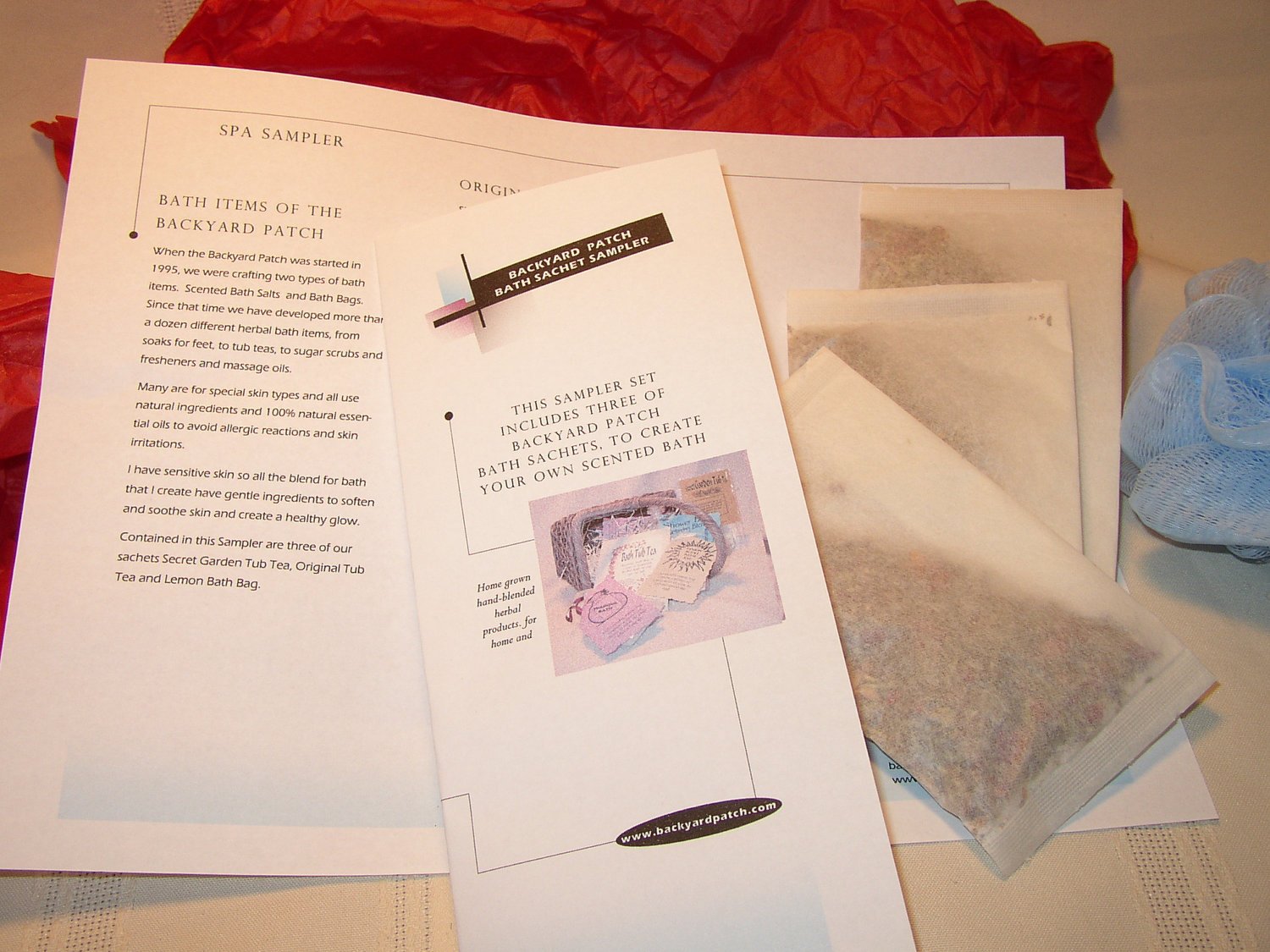 ** Tub Tea Sampler - This Sampler gives a glimpse at the more than 25 unique bath blends created by the Backyard Patch, giving you a chance to explore the quality of our Bath Collection. This contains 3 of our popular bath tub sachets. Each is packed in an oversized tea bag: Relaxing Bath Tub Tea (our Original Tub Tea) a blend of rose, lavender and other herbs to cleanse and detoxify. Soothing Secret Garden Tub Tea a blend of rose, lavender, spearmint and Lemon Balm. Lemon Bath Bag Blend a blend of lemon balm, lemon verbena, rosemary, fennel seed and lemon peel.