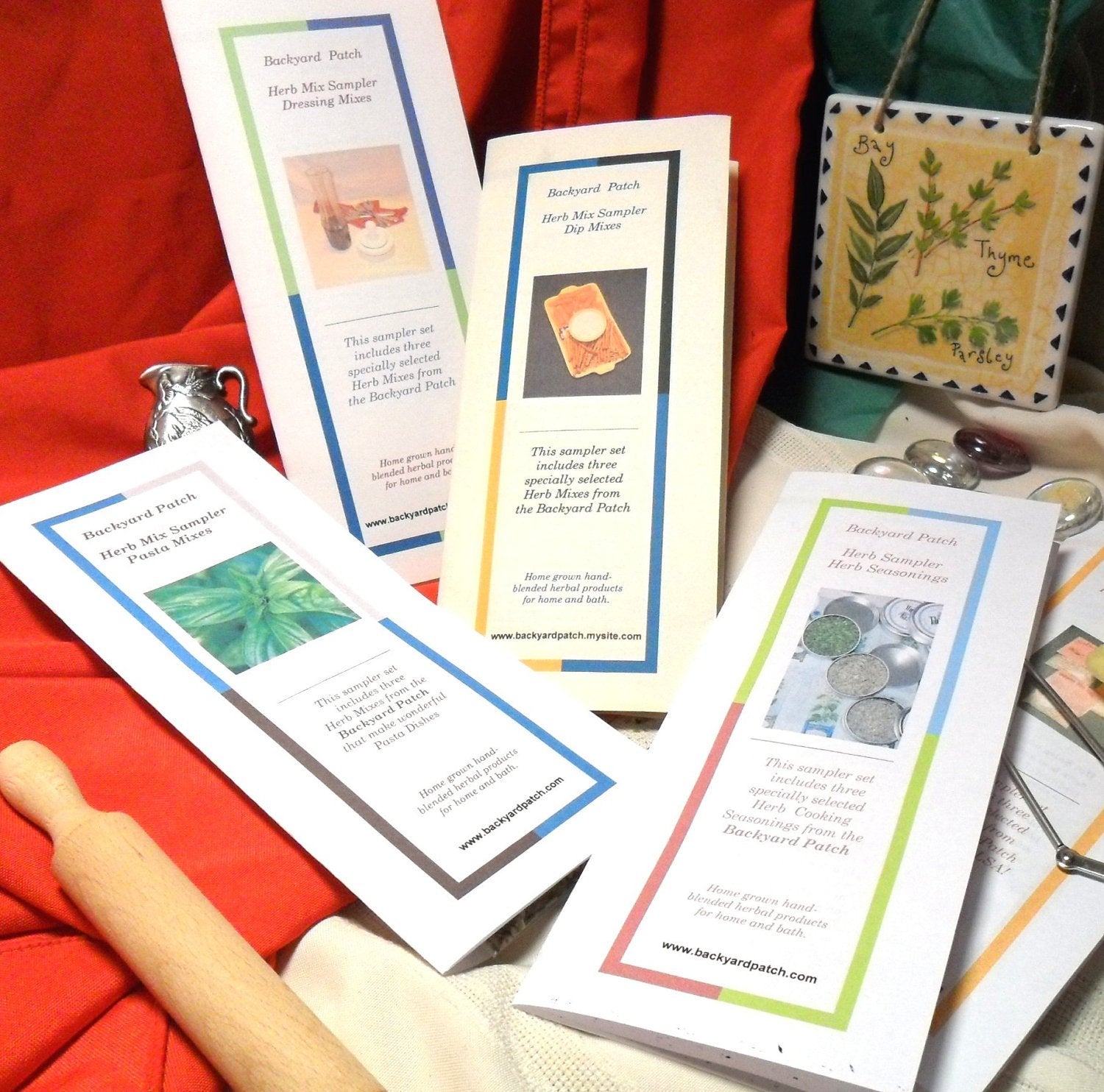 6- Dressing Sampler -- This example contains 3 of our dressing mixes (me make 6): Italian Dressing and Marinade, our second best seller, this dressing makes a perfect marinade for chicken and beef as well as a traditional, but not bitter, Italian salad dressing; Patch French Dressing is a vinegar and oil French that is unique in flavor and can also double as a marinade; Ranch Dressing / Dip, makes a traditional buttermilk dressing, but when blended with sour cream makes a great vegetable dip as well.