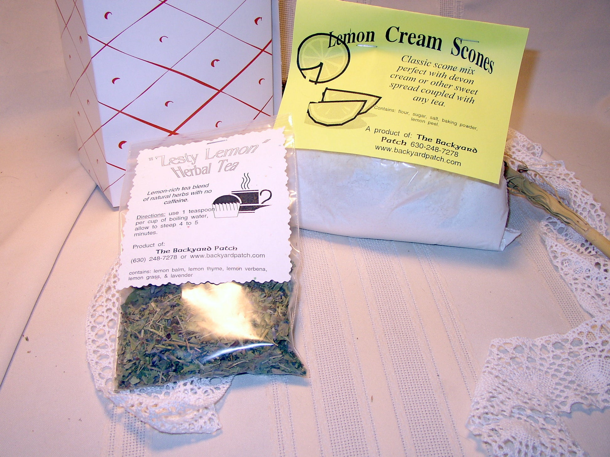 This unique combination includes an herb infused scone mix coupled with the perfect herbal tea crafted to suit the scone blend. The scone mix, tea and some cotton infusers is packaged in a decorative box.