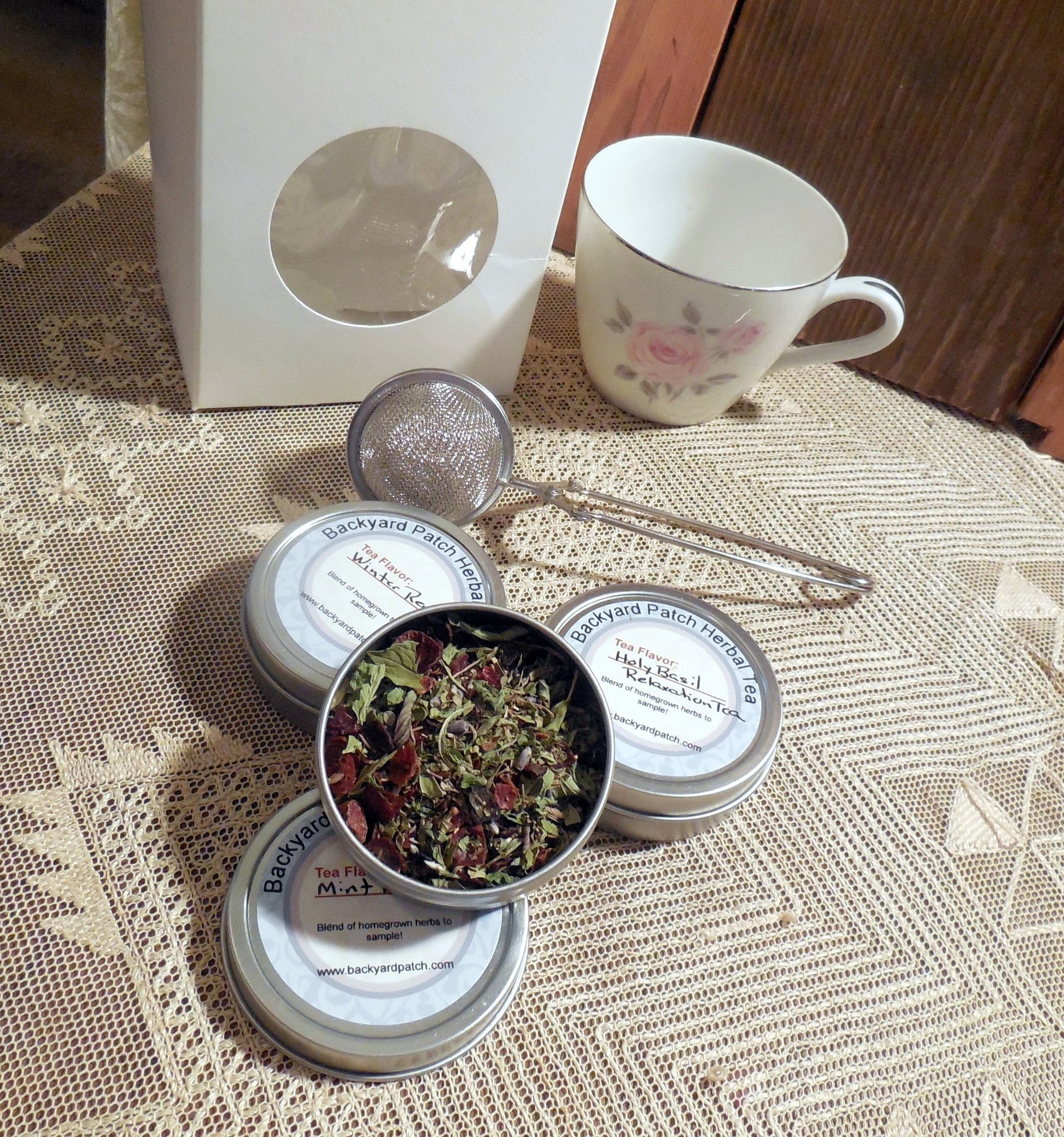 This silver edged Demi tea cup with delicate rose pattern on one side (no saucer) is packaged as the perfect gift along with three mini tins (about 1/4 cup) of our hand-blended, home-grown herb teas.