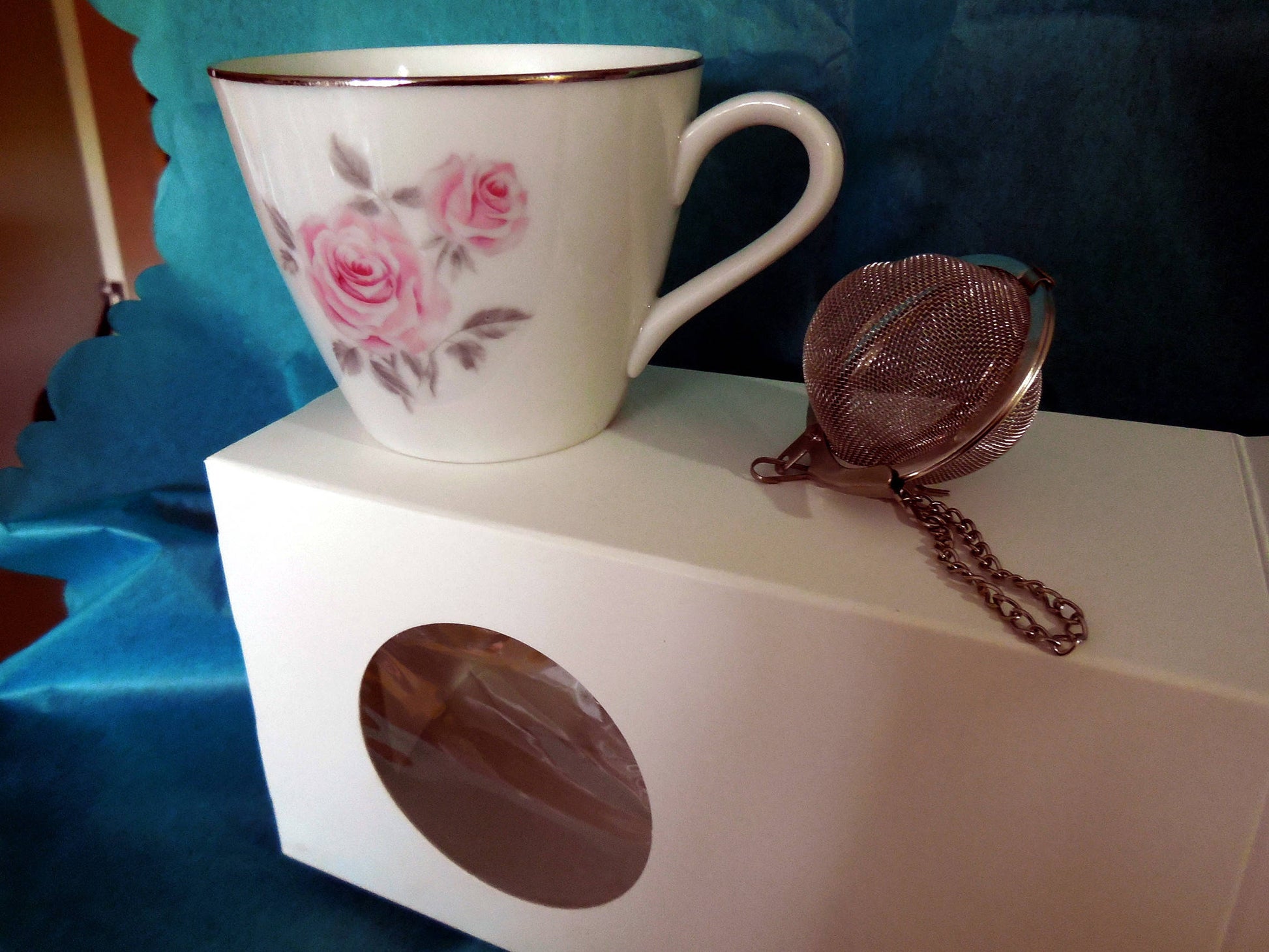 Tea cup with tea tins, Demi tea cup and three mini tins herb tea, herbal tea, rose hip, lavender, tisane, gift basket, gift set, gift box