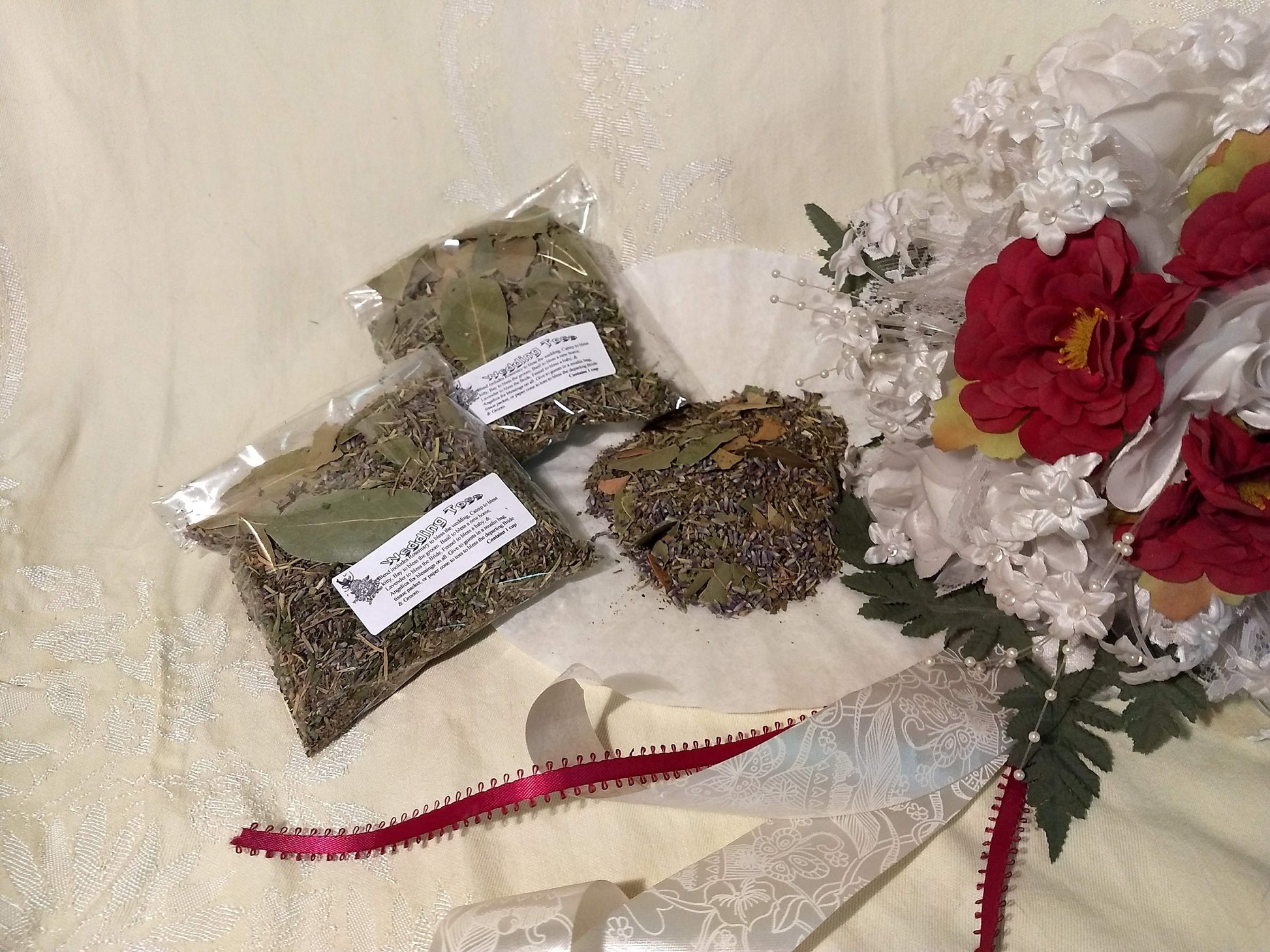 Blend includes Rosemary to bless the wedding, Catnip to bless kitty, Chamomile to bless the puppy, Bay to bless the groom, Basil to bless a new home, Lavender to bless the Bride, Fennel to bless a baby, & Angelica for blessings on all.