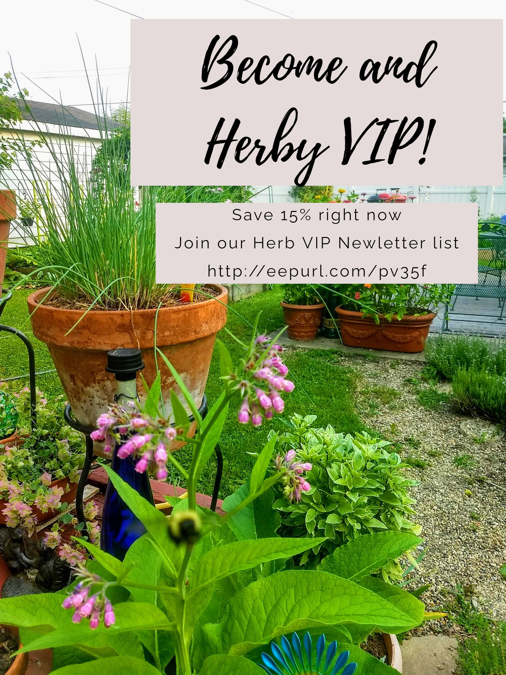 We have a monthly email newsletter that contains coupons, articles on growing and using herbs and recipes with herbs. To join this newsletter all you need to do is click the word JOIN. We never share your information with outside sources.