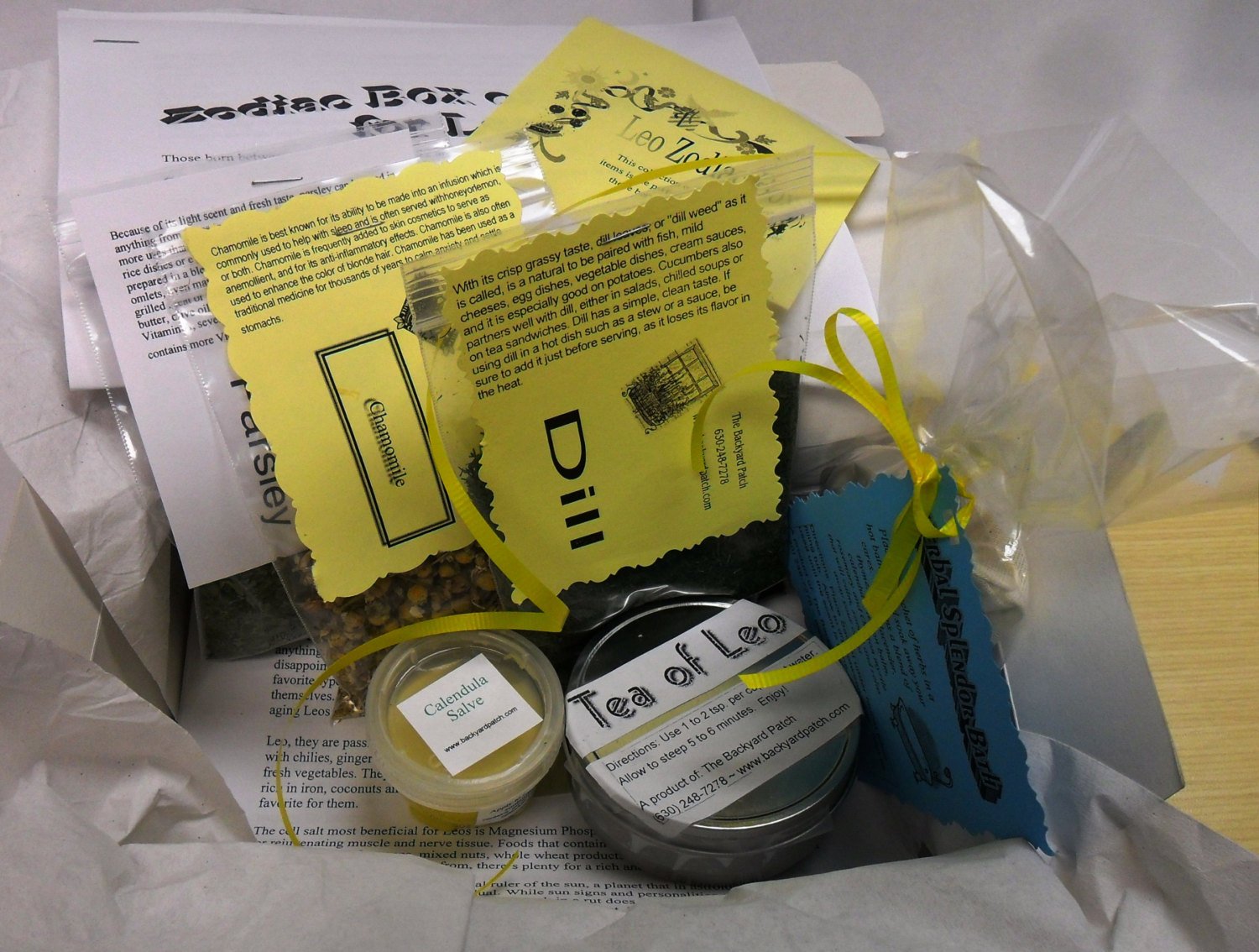 All of the above listed items are gathered together in a decorative box with a printout of Herb and Zodiac Information matched to the Sign of Leo.